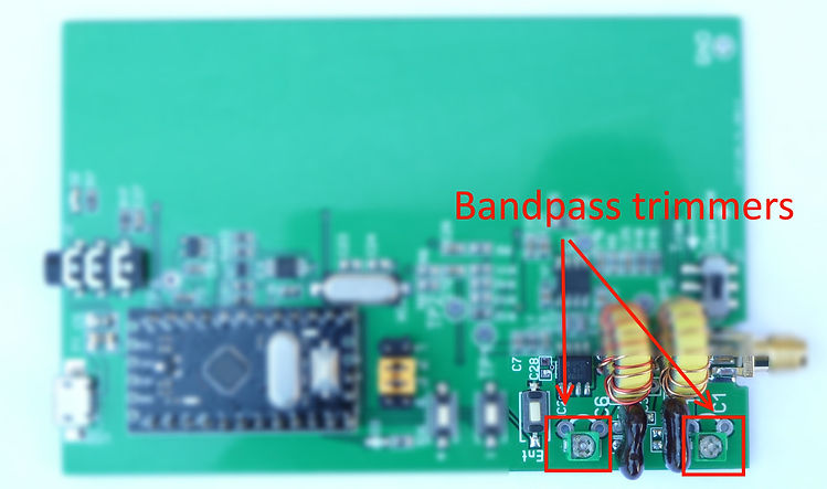 Picture indicates with red squares the bandpass trimmers C1 and C6.